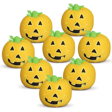 Our fun-sized Jack-o-Lantern plush makes an attractive addition to any Halloween party or a special treat for those little tricksters! More friendly than frightening, this festive pumpkin has charming details like an embroidered face and velvety green stem with leaf. Cheerful, plump and squishy; this Halloween Jack-o-Lantern will make even the spookiest ghoul smile! Our value pack makes excellent party favors, prizes or Halloween gifts! Each pack includes 8 Halloween Jack-o-Lanterns.