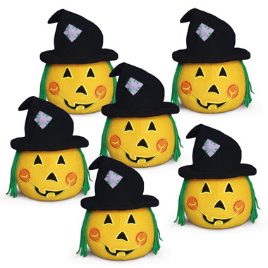 Our fun-sized Jack-o-Lantern Witch makes an attractive addition to any Halloween party or a special treat for those little tricksters! More friendly than frightening, this spellbinding witch has charming details like an embroidered face, green yarn hair, and a black hat with patch. Cheerful, plump and squishy; this Halloween Witch Jack-o-Lantern will make even the spookiest ghoul smile! Our value pack makes excellent party favors, prizes or Halloween gifts! Each pack includes 6 Halloween Witch Jack-o-Lanterns.