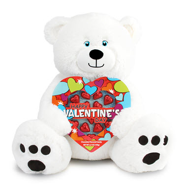 A unique and fun way to let someone know you are thinking of them on Valentine's Day! This adorable oversized bear is sure to bring a smile to their face as he holds a large, decorative box of chocolate hearts wishing them a “Happy Valentine's Day”. This jumbo bears sits 20” tall and has super soft, white fur making him cute and extra huggable! Each candy box contains 6.7 ounces of chocolate flavored heart candy individually wrapped in a red foil wrapper. “Happy Valentine's Day Stuffed Bear Gift” will make anyone feel special on Valentine’s Day!